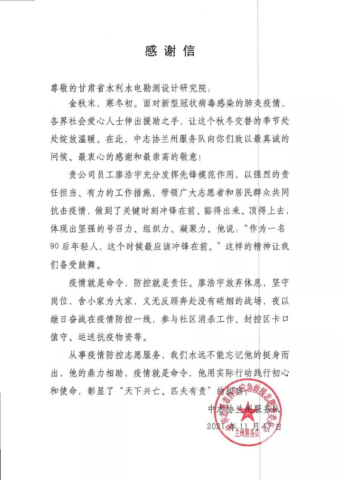 近日,水電設計院收到中志協(xié)蘭州服務隊和團結(jié)新村街道天平街社區(qū)發(fā)來的感謝信。信中對水電設計院規(guī)劃院員工廖浩宇在此次疫情發(fā)生后,主動請纓參加疫情防控服務工作,甘當疫情防控最美逆行者,持續(xù)堅持26天志愿者服務的先進事跡表示感謝。