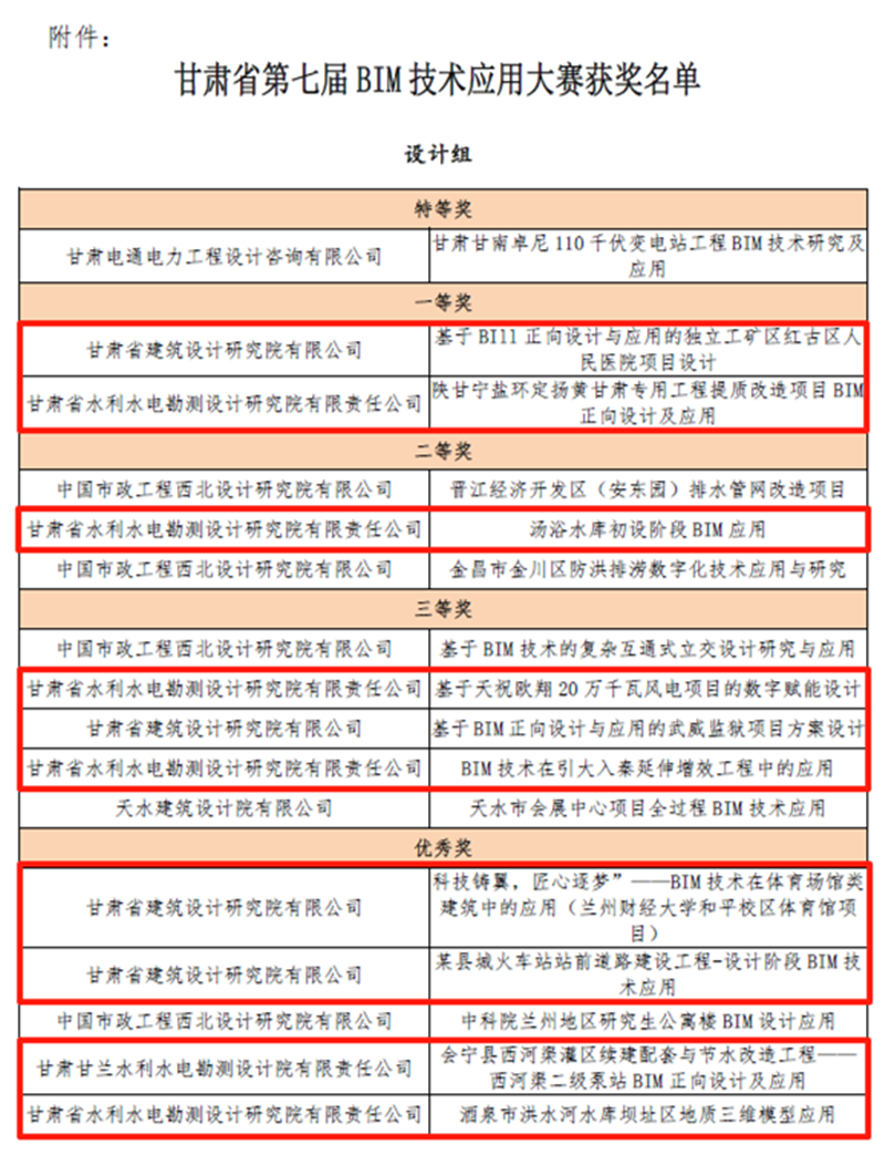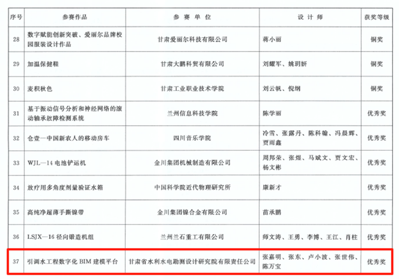 在甘肅省第七屆BIM技術(shù)應用大賽中,建筑設計院、水電設計院報送的項目共斬獲12項獎勵,包攬了設計組16個獎項中的10項。在甘肅省第五屆“創(chuàng)新杯”工業(yè)設計大賽中,水電設計院《引調(diào)水工程數(shù)字化BIM建模平臺》項目獲優(yōu)秀獎。在第十七屆全省職工優(yōu)秀技術(shù)創(chuàng)新成果獎中,水電設計院、土木工程院申報的兩個項目分獲創(chuàng)新成果獎三等獎,其中,《棄渣場三維設計平臺》項目是全省水利系統(tǒng)唯一獲獎成果。