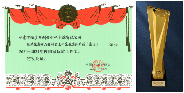 甘肅省城鄉(xiāng)規(guī)劃設(shè)計(jì)研究院勘察、設(shè)計(jì)的“蘭州東航國(guó)際廣場(chǎng)(南區(qū))項(xiàng)目”榮獲“2020—2021年度國(guó)家優(yōu)質(zhì)工程獎(jiǎng)”。此前,該項(xiàng)目已榮獲2020年工程建設(shè)項(xiàng)目綠色建造設(shè)計(jì)水平評(píng)價(jià)三等成果、2020年度甘肅省優(yōu)秀工程勘察設(shè)計(jì)三等獎(jiǎng)等多項(xiàng)榮譽(yù)。