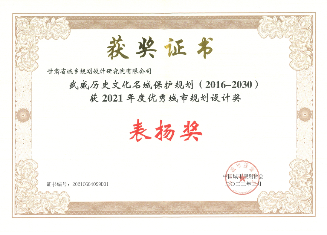 近期,由省規(guī)劃設(shè)計(jì)院編制的《武威歷史文化名城保護(hù)規(guī)劃(2016-2030)》項(xiàng)目榮獲全國(guó)“2021年度優(yōu)秀城市規(guī)劃設(shè)計(jì)獎(jiǎng)”表?yè)P(yáng)獎(jiǎng),為我省歷史文化名城保護(hù)專(zhuān)業(yè)類(lèi)唯一獲獎(jiǎng)項(xiàng)目。