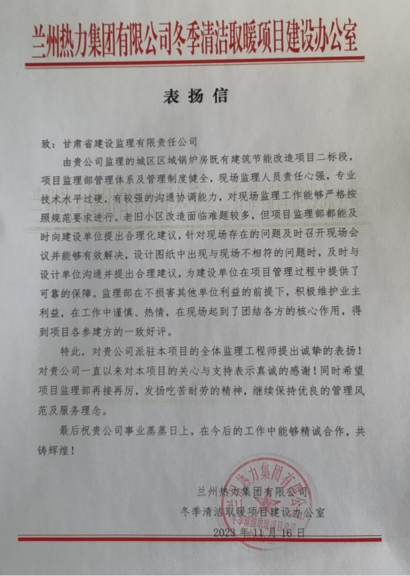 近日,省建設(shè)監(jiān)理公司收到蘭州熱力集團有限公司冬季清潔取暖項目建設(shè)辦公室發(fā)來的表揚信,對省建設(shè)監(jiān)理公司城區(qū)區(qū)域鍋爐房既有建筑節(jié)能改造項目二標段監(jiān)理部全體人員表示感謝。
