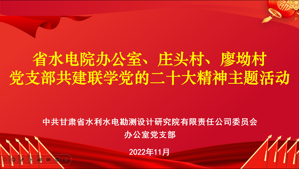 為持續(xù)促進黨的二十大精神學習貫徹走深走實,使黨的二十大精神進村入戶、深入人心,11月22日,甘肅省水利水電勘測設計研究院有限責任公司辦公室黨支部與幫扶村西峰區(qū)莊頭村黨支部、廖坳村黨支部開展共建聯學黨的二十大精神主題活動。