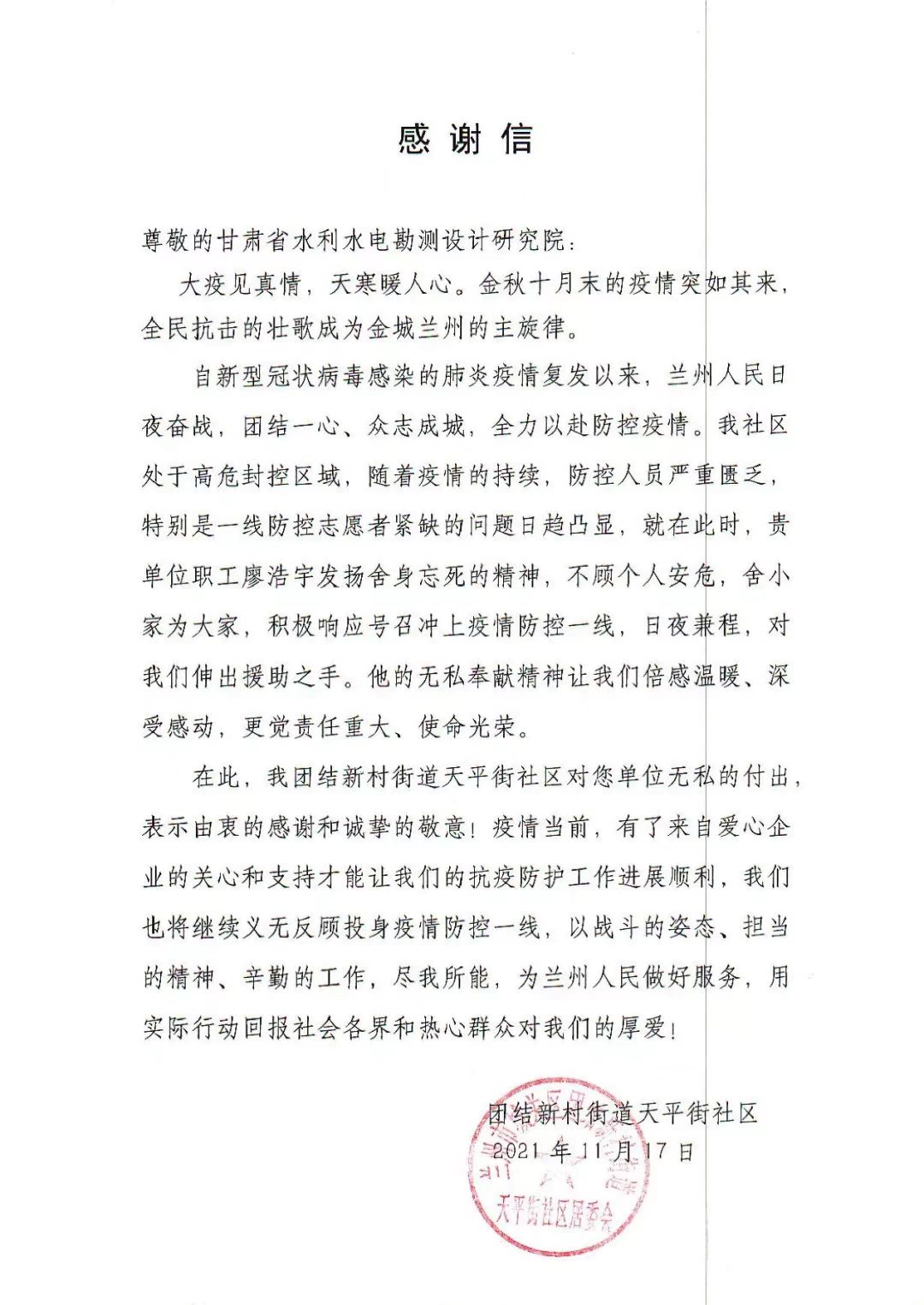 近日,水電設計院收到中志協(xié)蘭州服務隊和團結(jié)新村街道天平街社區(qū)發(fā)來的感謝信。信中對水電設計院規(guī)劃院員工廖浩宇在此次疫情發(fā)生后,主動請纓參加疫情防控服務工作,甘當疫情防控最美逆行者,持續(xù)堅持26天志愿者服務的先進事跡表示感謝。