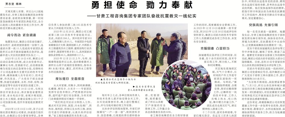 1月15日,《甘肅日?qǐng)?bào)》第4版刊載《勇?lián)姑?勠力奉獻(xiàn)——甘肅工程咨詢集團(tuán)專家團(tuán)隊(duì)奮戰(zhàn)抗震救災(zāi)一線紀(jì)實(shí)》。該報(bào)道全面反映了集團(tuán)公司黨委心系災(zāi)區(qū)、聞令而動(dòng)的一系列擔(dān)當(dāng)作為務(wù)實(shí)舉措,深度展現(xiàn)了專家團(tuán)隊(duì)和干部職工向險(xiǎn)而行、甘于奉獻(xiàn)的抗震救災(zāi)生動(dòng)實(shí)踐,進(jìn)一步凝聚起奮力奪取抗震救災(zāi)全面勝利的強(qiáng)大力量。