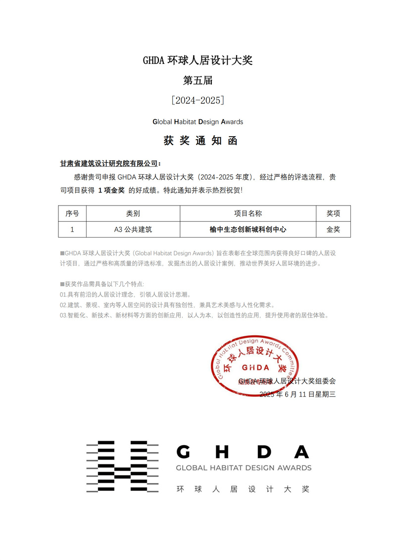 近日,備受矚目的第五屆GHDA環(huán)球人居設計大獎獲獎名單揭曉。甘肅工程咨詢集團旗下省建筑設計院精心打造的榆中生態(tài)創(chuàng)新城科創(chuàng)中心項目,繼榮獲美國綠色建筑委員會頒發(fā)的LEED V4 BD+C鉑金級預認證、中國綠色建筑三星級預評價兩項權威認證后,再度摘得公共建筑類金獎,彰顯出我省在人居設計領域的卓越實力。