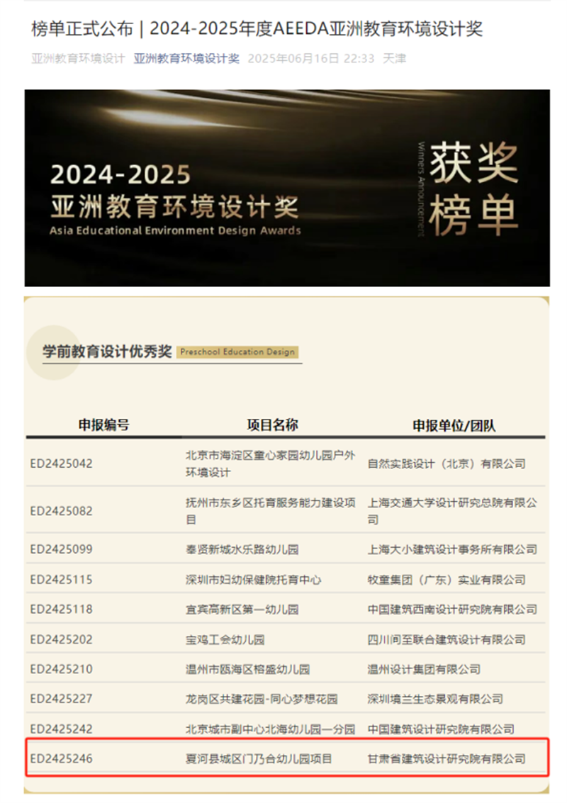 近日,備受矚目的2024-2025年度AEEDA亞洲教育環(huán)境設(shè)計獎(Asia Educational Environment Design Awards)獲獎名單正式揭曉。由甘肅工程咨詢集團旗下省建筑設(shè)計院設(shè)計的夏河縣城區(qū)門乃合幼兒園項目,從百余件參賽作品中脫穎而出,榮膺學(xué)前教育設(shè)計領(lǐng)域優(yōu)秀獎,為甘肅建筑設(shè)計行業(yè)贏得了國際聲譽。