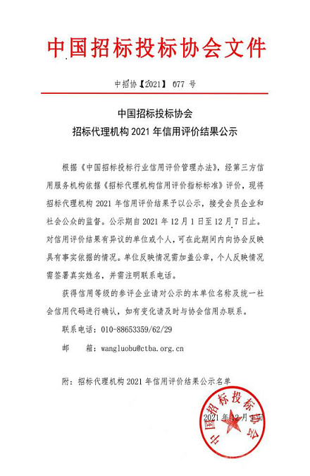 近日,在中國(guó)招標(biāo)投標(biāo)協(xié)會(huì)牽頭組織的2021年招標(biāo)代理機(jī)構(gòu)級(jí)信用評(píng)價(jià)認(rèn)證工作中,經(jīng)中招協(xié)委托的第三方信用服務(wù)機(jī)構(gòu)(國(guó)資委)商業(yè)信用中心及有關(guān)行業(yè)專(zhuān)家評(píng)審,招標(biāo)咨詢(xún)集團(tuán)子公司甘肅省招標(biāo)中心有限公司和甘肅金安建設(shè)工程項(xiàng)目管理有限公司獲得2021年招標(biāo)代理機(jī)構(gòu)AAA級(jí)信用評(píng)價(jià)最高等級(jí)認(rèn)證。