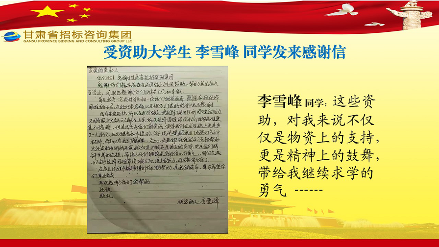 近日,張家川縣張棉驛鄉(xiāng)張棉村貧困大學(xué)生代表劉國熙、周長斌、李雪峰等向甘肅省招標(biāo)咨詢集團(tuán)有限責(zé)任公司發(fā)來感謝信,就招標(biāo)咨詢集團(tuán)給予學(xué)費(fèi)資助一事表達(dá)他們的感激之情。