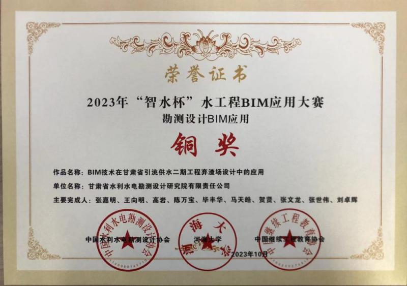 近日,中國(guó)水利水電勘測(cè)設(shè)計(jì)協(xié)會(huì)發(fā)布了2023年“智水杯”水工程BIM應(yīng)用大賽獲獎(jiǎng)項(xiàng)目,省水電設(shè)計(jì)院申報(bào)的《BIM技術(shù)在甘肅省引洮供水二期工程棄渣場(chǎng)設(shè)計(jì)中的應(yīng)用》獲得勘測(cè)設(shè)計(jì)MIM應(yīng)用銅獎(jiǎng)。