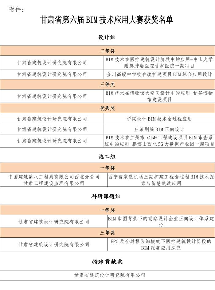 近日,甘肅省第六屆BIM技術(shù)應(yīng)用大賽落下帷幕,省建筑設(shè)計(jì)院選送的9項(xiàng)作品,經(jīng)過層層篩選、答辯評(píng)審,最終在185個(gè)參賽作品中脫穎而出,并分別獲獎(jiǎng)。省建筑設(shè)計(jì)院榮獲特殊貢獻(xiàn)獎(jiǎng)。