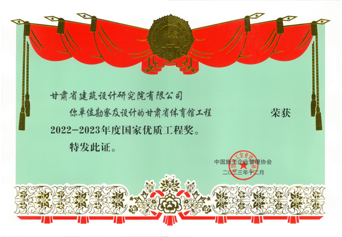 近日,從中國施工企業(yè)管理協(xié)會(huì)傳來好消息,由甘肅省工程勘察設(shè)計(jì)大師、省建筑設(shè)計(jì)院總建筑師馮志濤帶領(lǐng)團(tuán)隊(duì)設(shè)計(jì)的甘肅省體育館榮獲“2022-2023年度國家優(yōu)質(zhì)工程獎(jiǎng)”榮譽(yù)稱號(hào)。